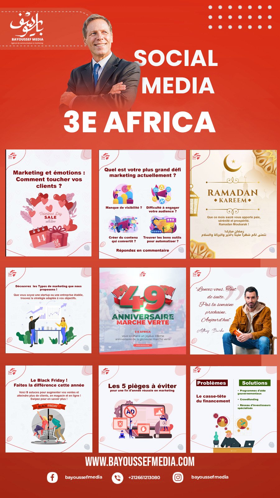 Dans le cadre de la stratégie de communication digitale de 3E Africa, nous avons réalisé une série de visuels professionnels destinés aux réseaux sociaux, principalement LinkedIn, Instagram et Facebook.